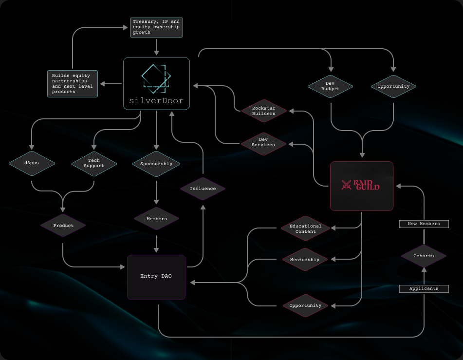 Silver Door is an attempt to fulfill an ecological niche in the Service DAO ecosystem.  Service DAOs greatest strength and value proposition is their capability to accelerate the growth of human capital.  Service DAOs, like RaidGuild, cultivate amounts of valuable human capital.  DAOs in this regard are the most potent accelerants of human professional growth yet.  They quickly help humans blossom into rockstar builders.
